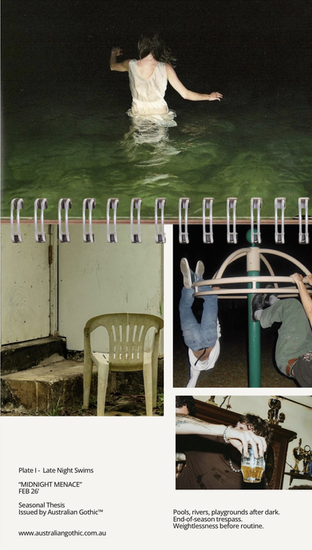 Each month in Australian Gothic™ is organized around a single thematic condition. This theme acts as a lens through which the month is studied. Each week, one Plate isolates a specific environment, selected in accordance with the Design House's Founding Charter (Beach/City/Country/Suburbia) and examines how the theme manifests within it. Together, the Plates provide a structured authorship for covering & studying Australia’s darker cultural realities, documenting what has long existed but remained under-represented.